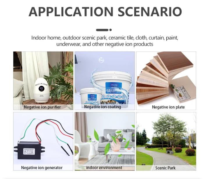 Application fields: indoor and outdoor air negative ion, paint, air purifier, negative ion generator, plate, tile, cloth, etc.