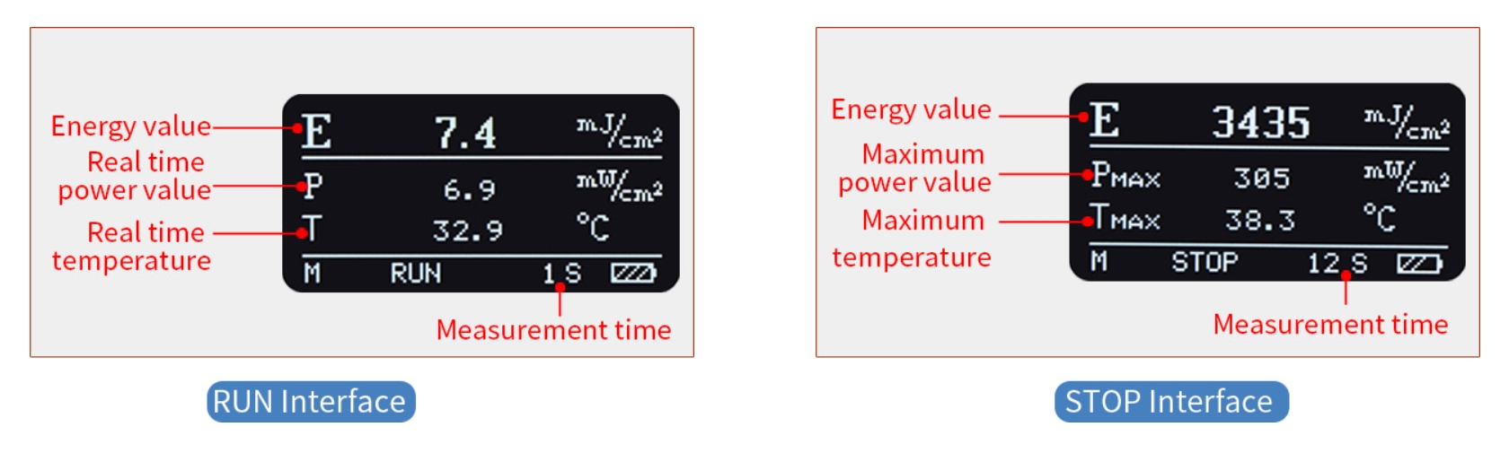 Real-time power value and real-time temperature value can be dynamically displayed during measurement.The energy accumulation value, maximum power value and maximum temperature value are displayed after the measurement.